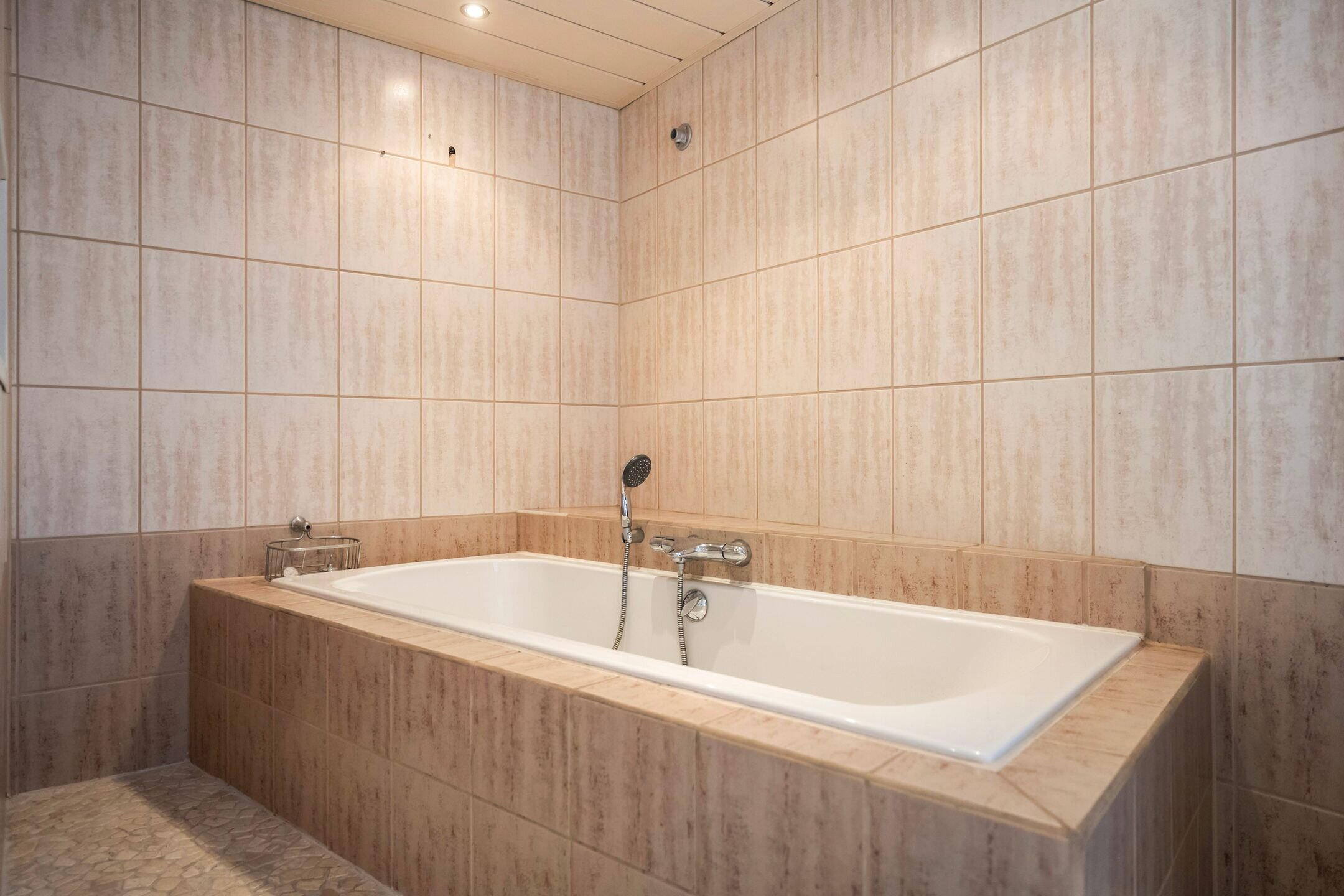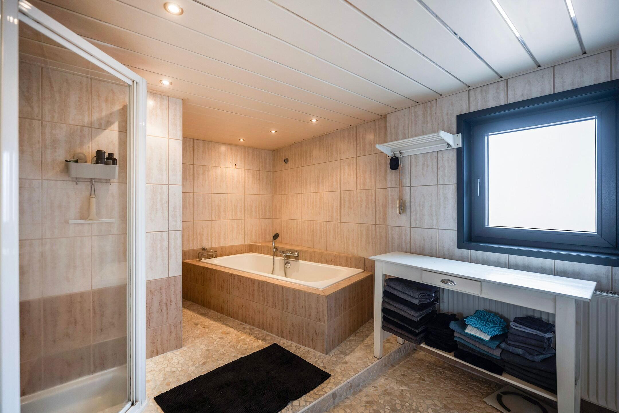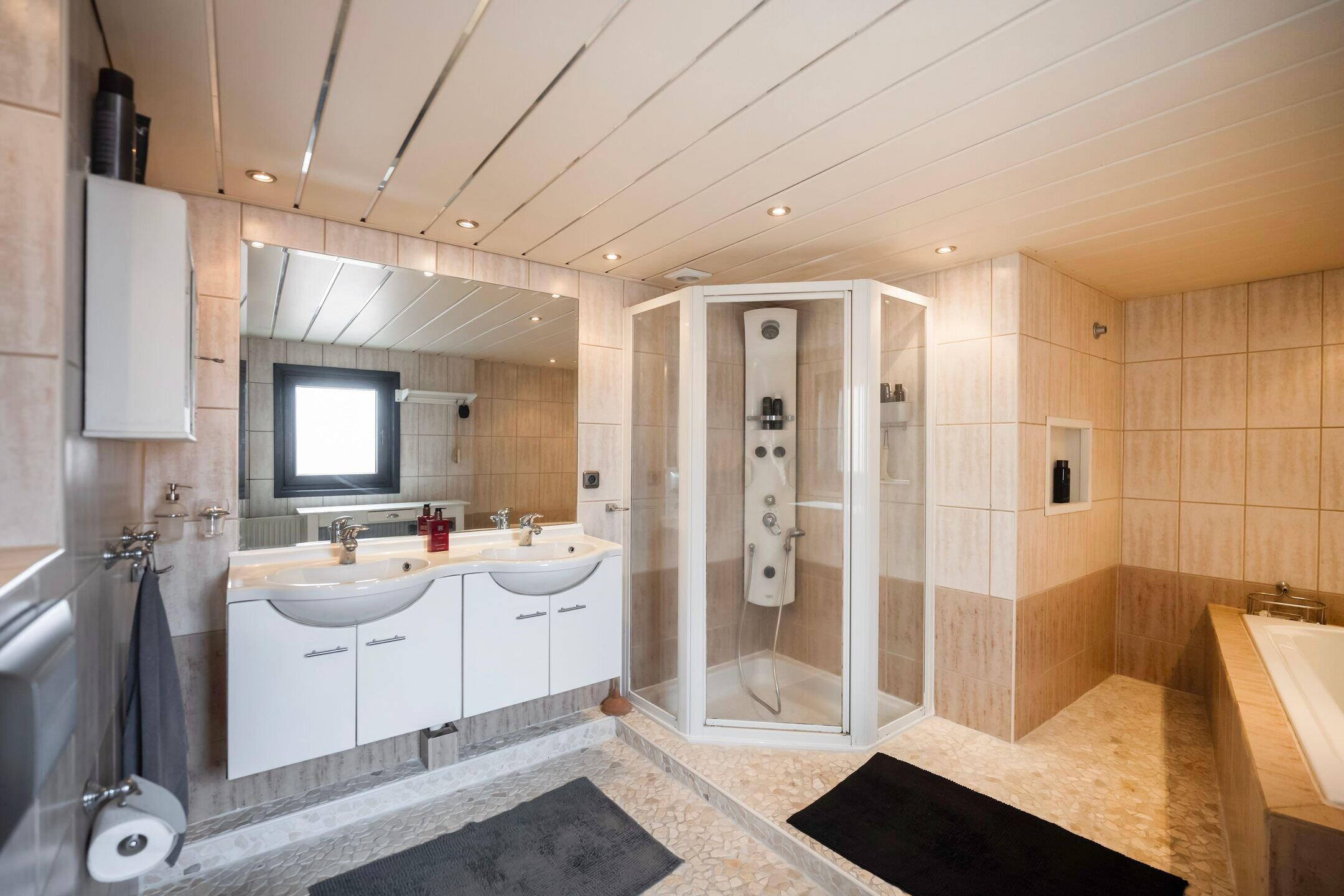 - Dubbele wastafel, inloopdouche, ligbad, toilet, en wastafelmeubel